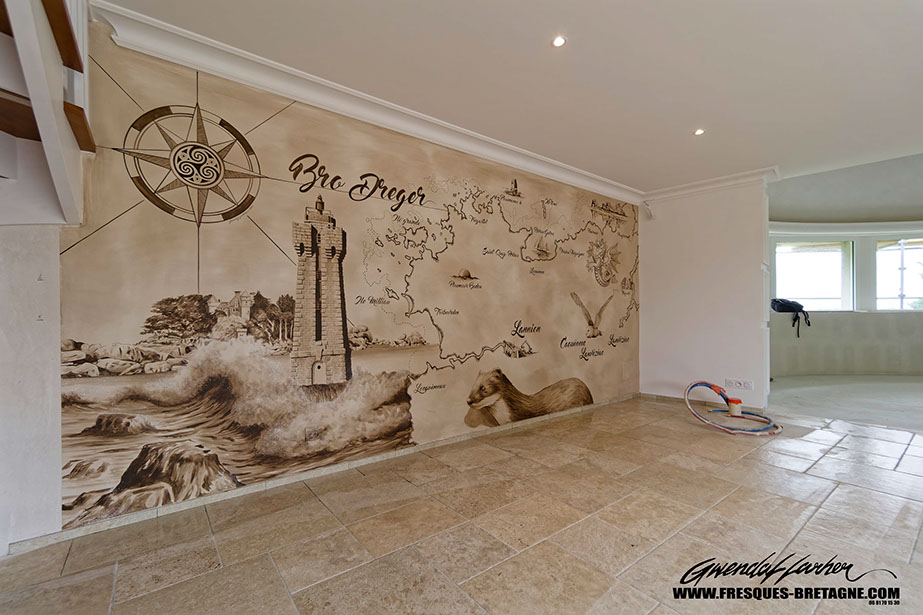Carte de la baie de Plestin les grèves peinte dans une très belle maison à Guerlesquin, peintures acryliques.