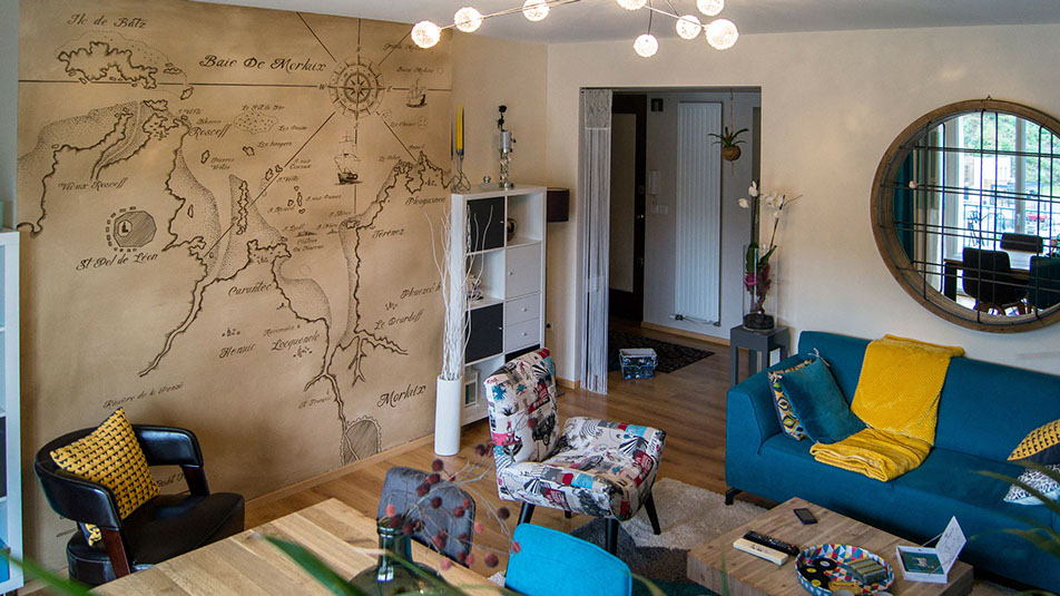 Carte de la baie de Morlaix peinte dans ce belle appartement face aux écluses de Morlaix, peintures acryliques.