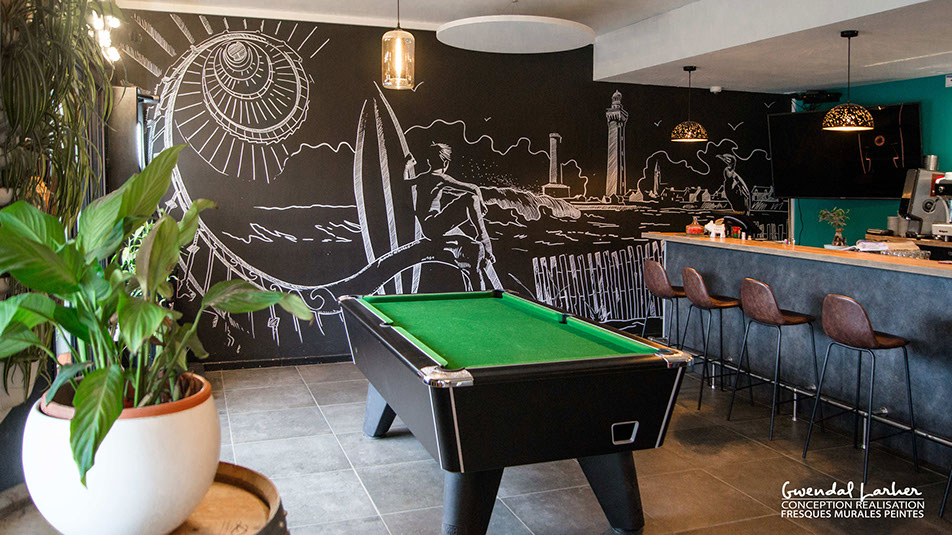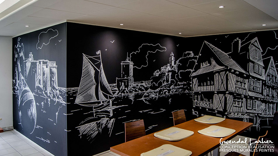 Fresque murale sur le thème du phare d'Eckmuhl restaurant le Tom Café à Porz Carn ( La torche), dessin crayon Posca .
