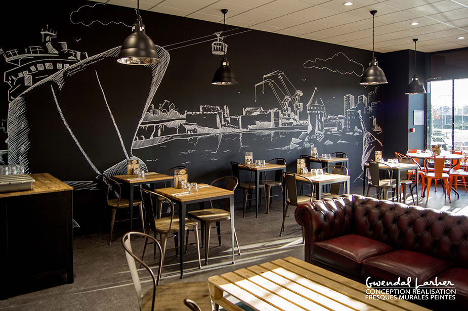 Décors de style indus pour la crêperie "Gwenn ha Du " à Quimper, dessin crayon Posca.
