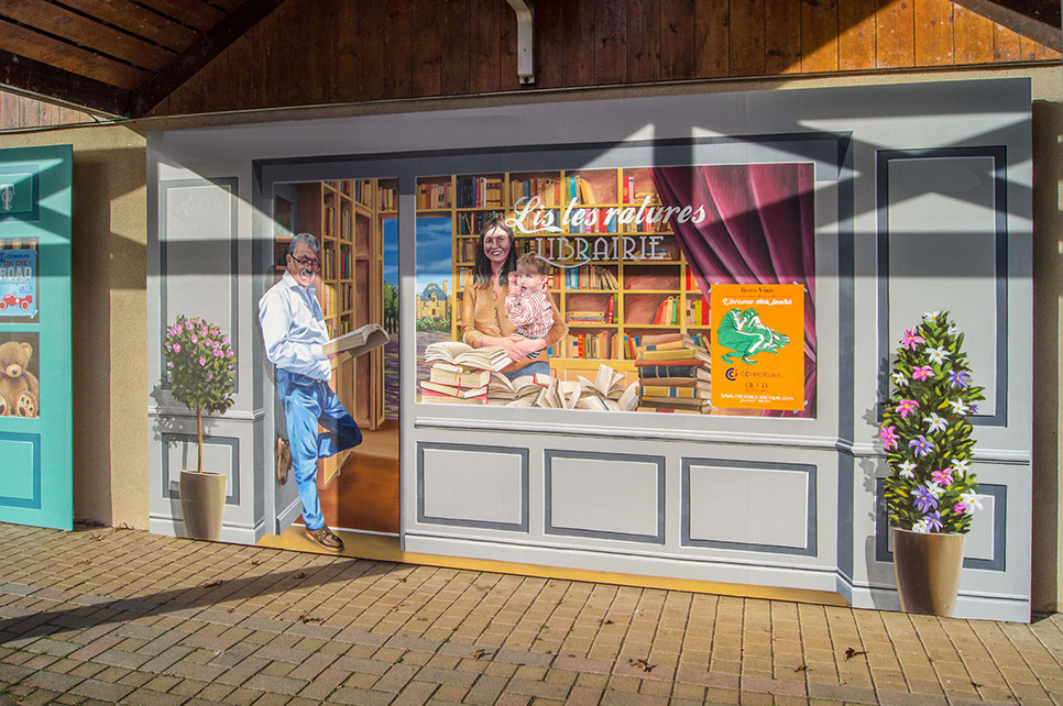 "La mercerie " fresque en trompe-l’œil réalisé pour le circuit de murs peints de la ville de Guerlesquin .