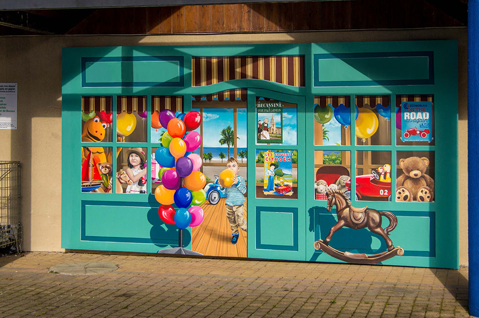 "Le Coffre a jouet" trompe-l’œil réalisé au super U de Guerlesquin.