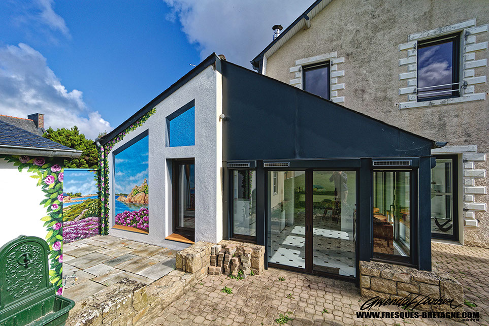 Fresque en trompe-l'oeil peinte sur une maison cube à l'île grande Trébeurden.