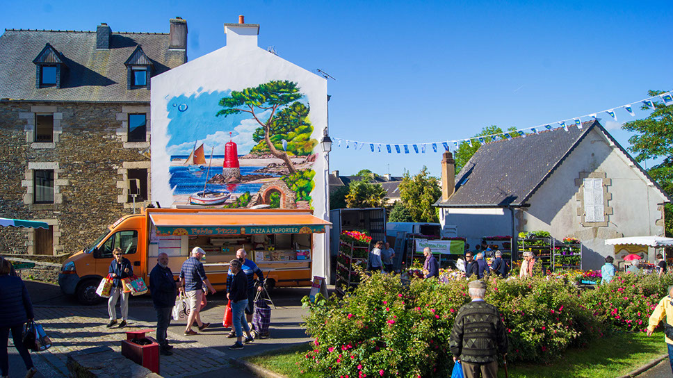 Réalisée en couleurs, cette peinture murale met en scène l’esprit paisible du village, véritable trait d’union entre terre et mer. La composition propose une immersion dans un univers authentique, mettant en lumière le site gallo-romain du Hogolo, témoignage précieux de l’histoire du territoire. En arrière-plan, l’anse de Toul an Héry se dévoile, animée par des vieux gréements évoquant les racines maritimes et l’identité bretonne de la commune.