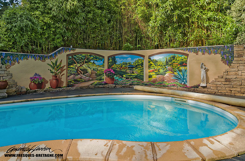 J'interviens dans les résidences pour créer des perspectives uniques. Trompe-l'œil, fresques de piscine ou élégant habillage de jardins, chaque création est une pièce de collection pensée pour ennoblir votre patrimoine.