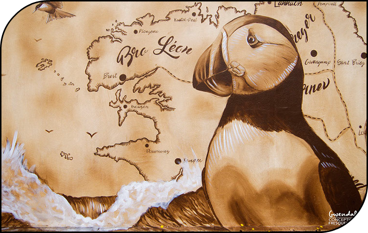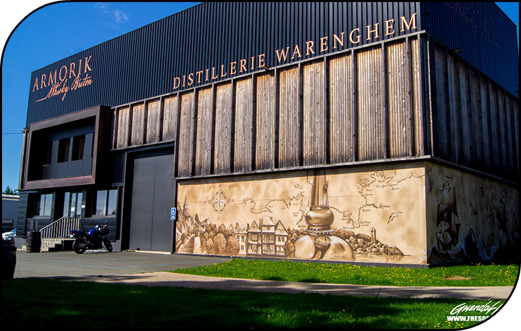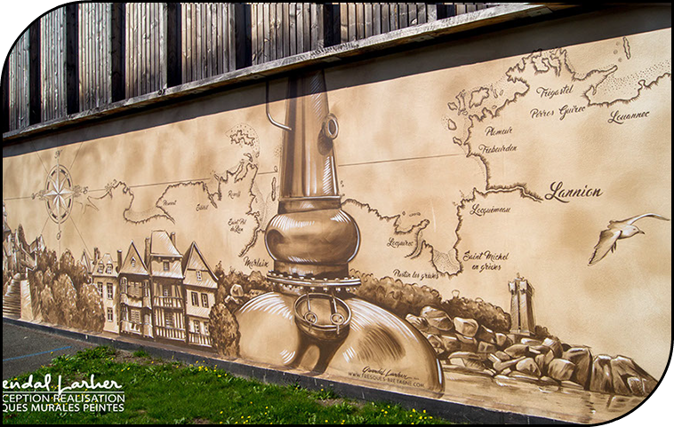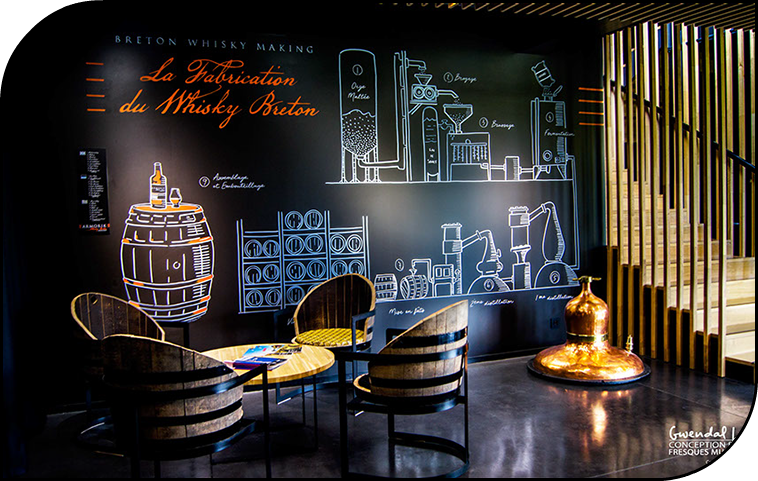 Dans le cadre de la rénovation de ses bâtiments, la distillerie Warenghem à Lannion m’a confié la réalisation d’une fresque murale sur mesure, en remplacement d’un ancien décor altéré par le temps.