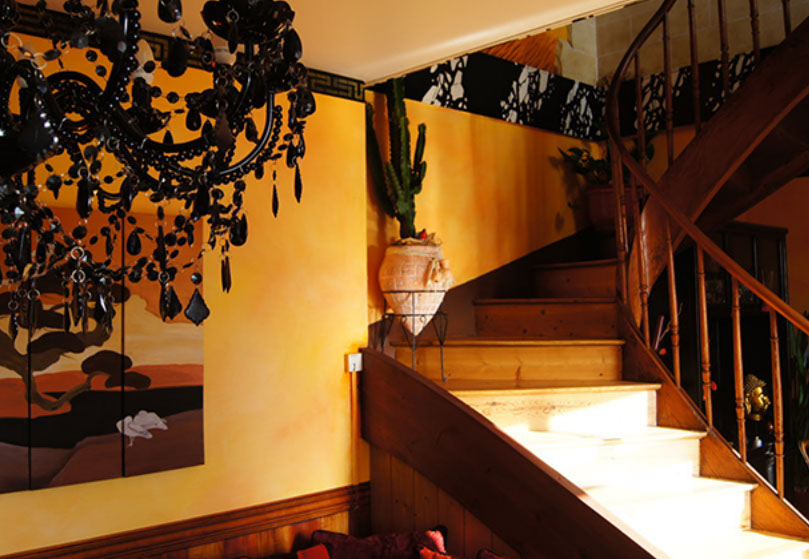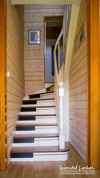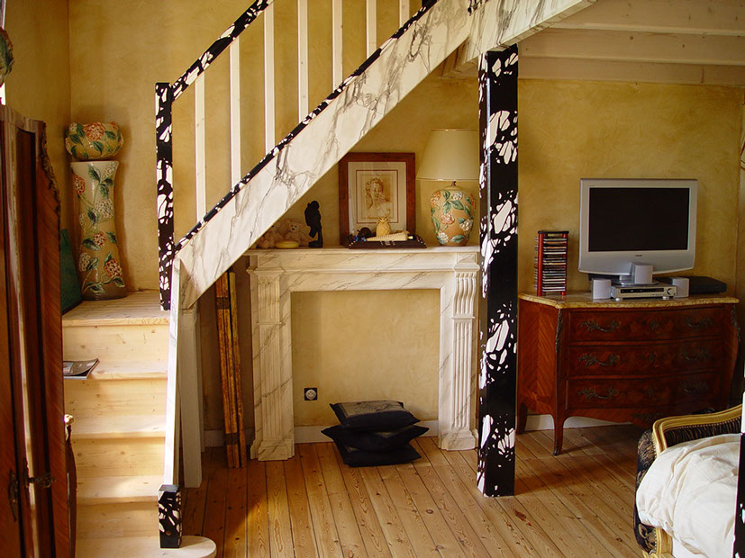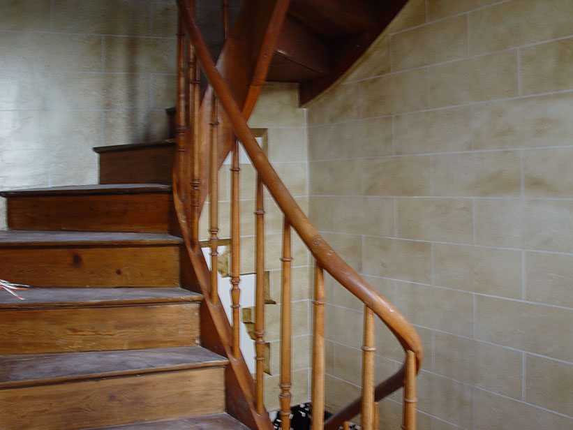 Patine imitation de chaux et faux marbre dans la cage d'escalier.