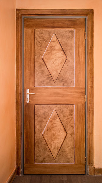 Réalisation d'une patine murale et imitations de bois sur les portes et moulures.