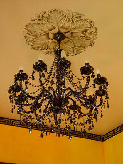 Décoration en grisaille en bas relief pour ce plafonnier et frise Grecque le long du haut du mur.