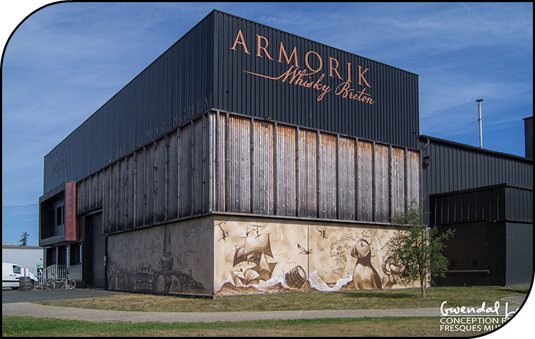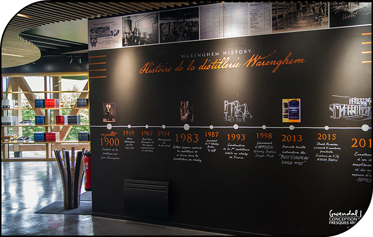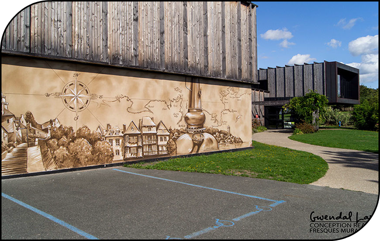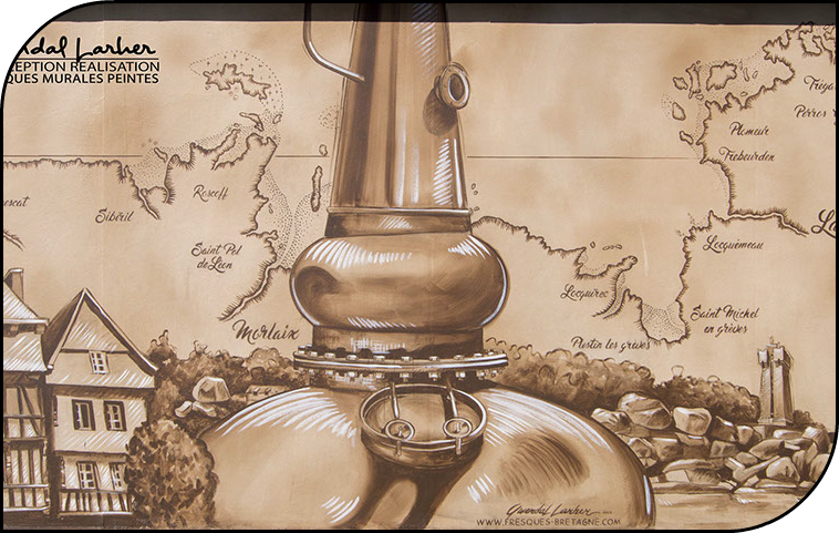 Dans le cadre de la rénovation de ses bâtiments, la distillerie Warenghem à Lannion m’a confié la réalisation d’une fresque murale sur mesure, en remplacement d’un ancien décor altéré par le temps.