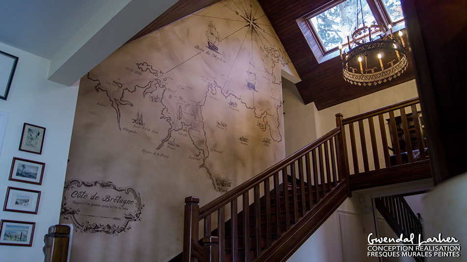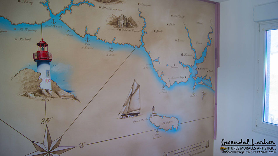 Carte de la baie de Plestin les grèves peinte dans une très belle maison à Guerlesquin, peintures acryliques.