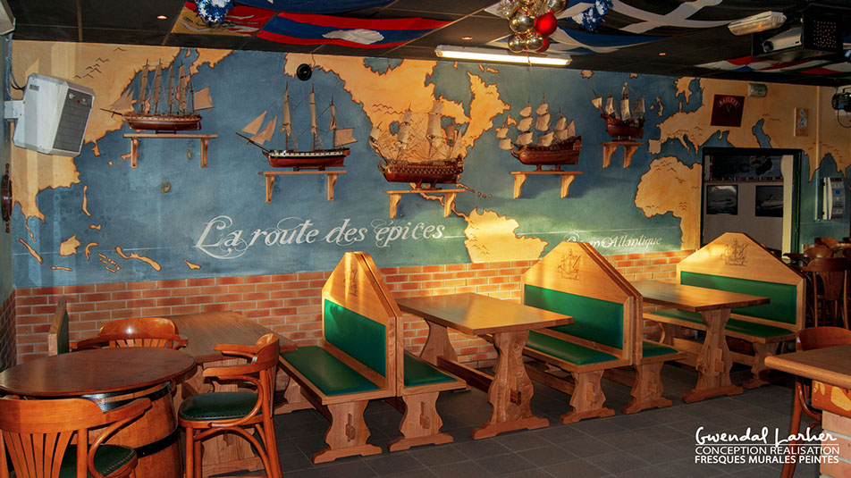 Carte du monde représantant la route des épices , restaurant le Vasco de Gama à Roscoff, peintures acryliques.