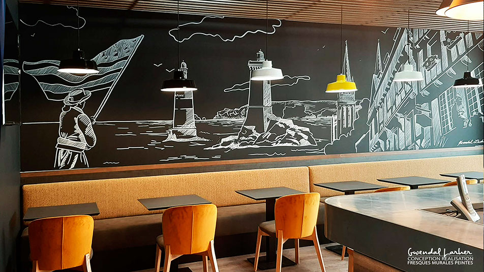 Fresque murale sur le thème du phare d'Eckmuhl restaurant le Tom Café à Porz Carn ( La torche), dessin crayon Posca .