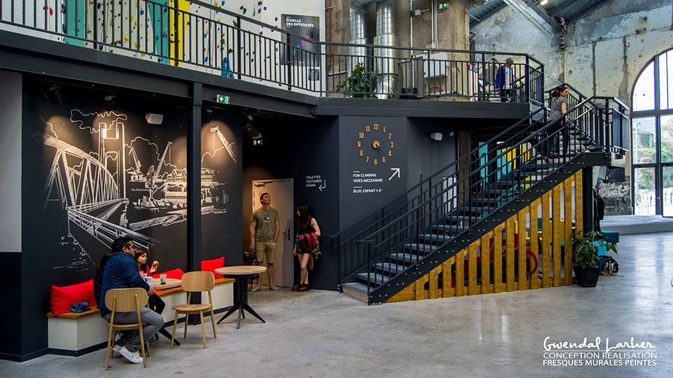 Dessin de style indus réaliser pour la salle d'escalade Climb up à Brest, dessin crayon Posca.