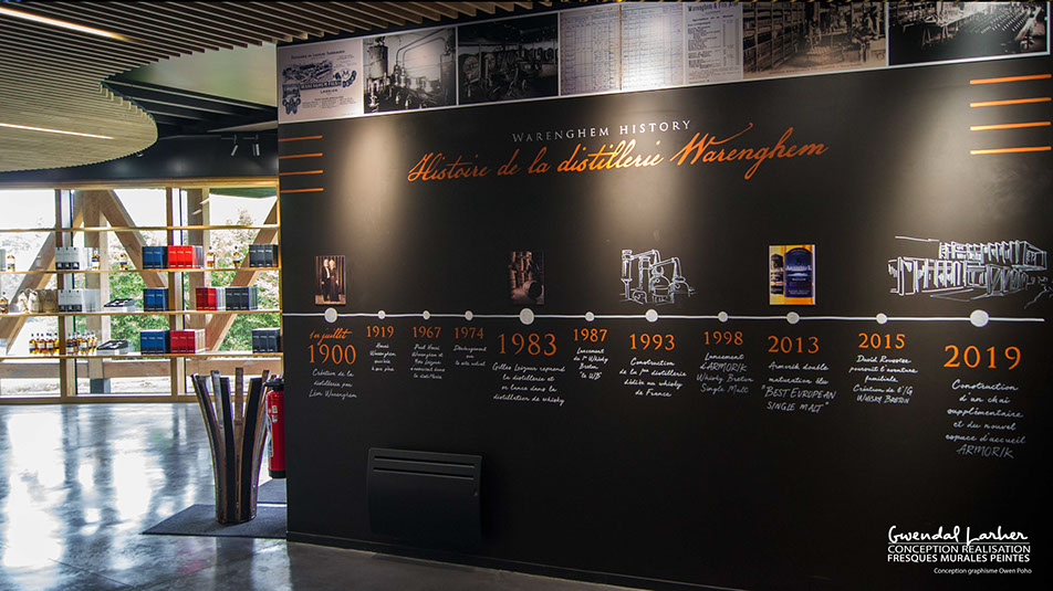 Frise historique réaliser au crayon posca et peinture acrylique pour la salle d'entrée de la distillerie Warenghem à Lannion, Dessin crayon Posca et peinture acrylique.