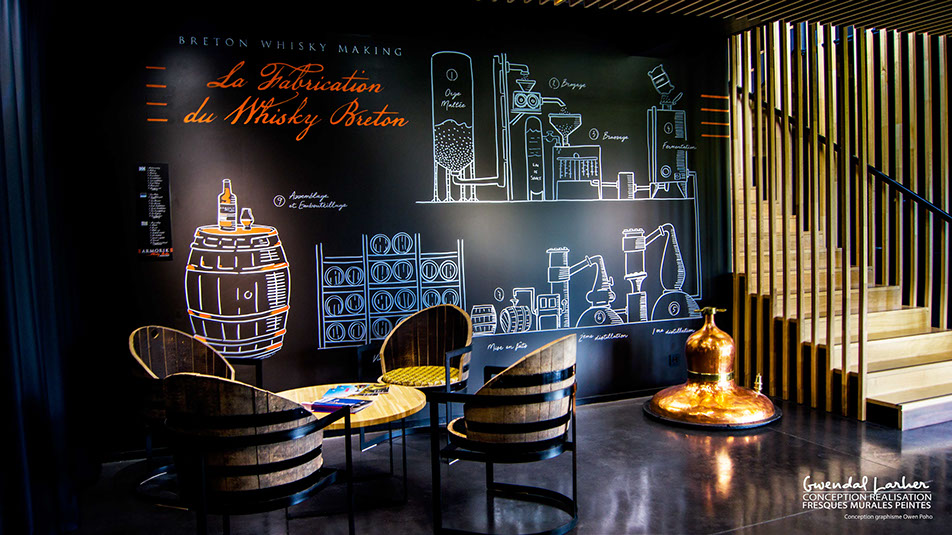 Décoration réalisée au crayon posca pour la salle d'accueil de la distillerie Warenghem à Lannion, dessin crayon Posca et peinture acrylique.