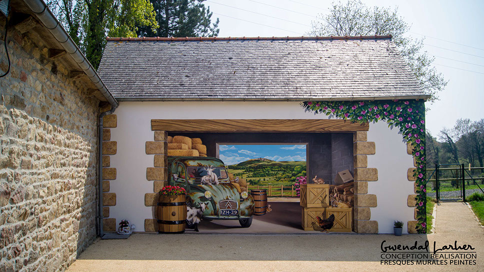 Fresque en Trompe-l’œil peintures des mont d'arrées avec une vieille dodoche.