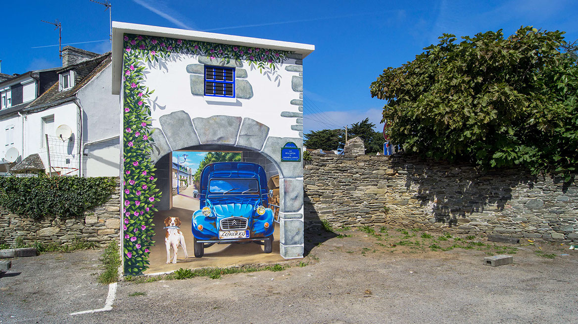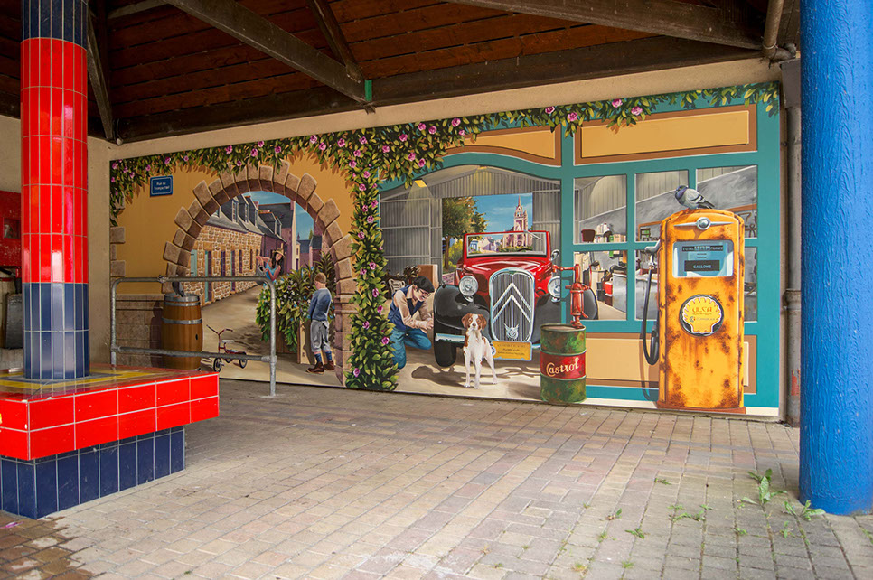 "Le garage" trompe-l’œil; circuit de peintures murales Super U de Guerlesquin