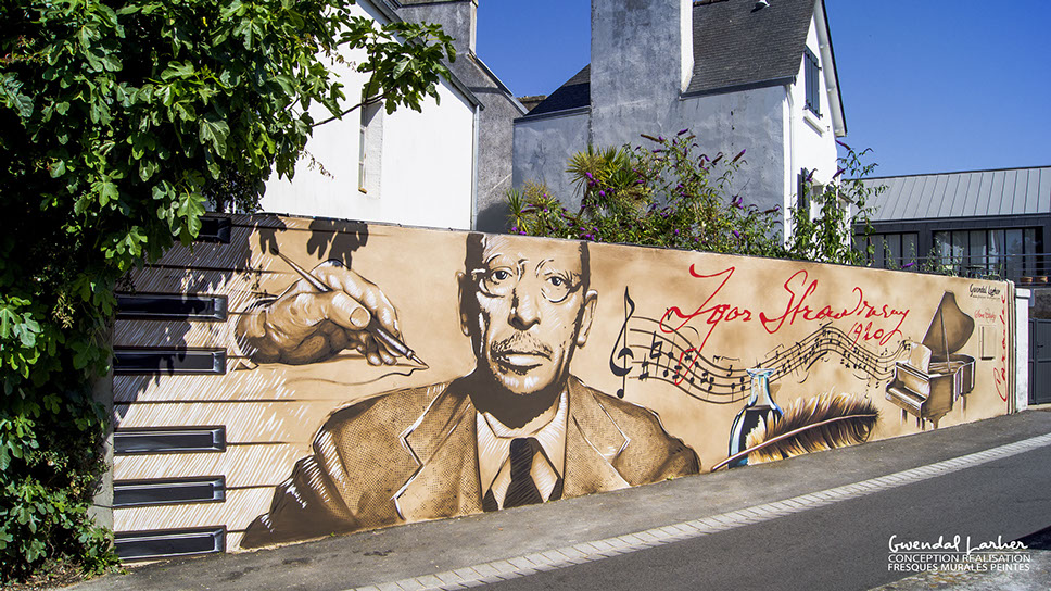 La fresques des 100 ans de Igor Stravinsky. Peinture de street-art réalisée à Carantec visible rue Dupleix.
